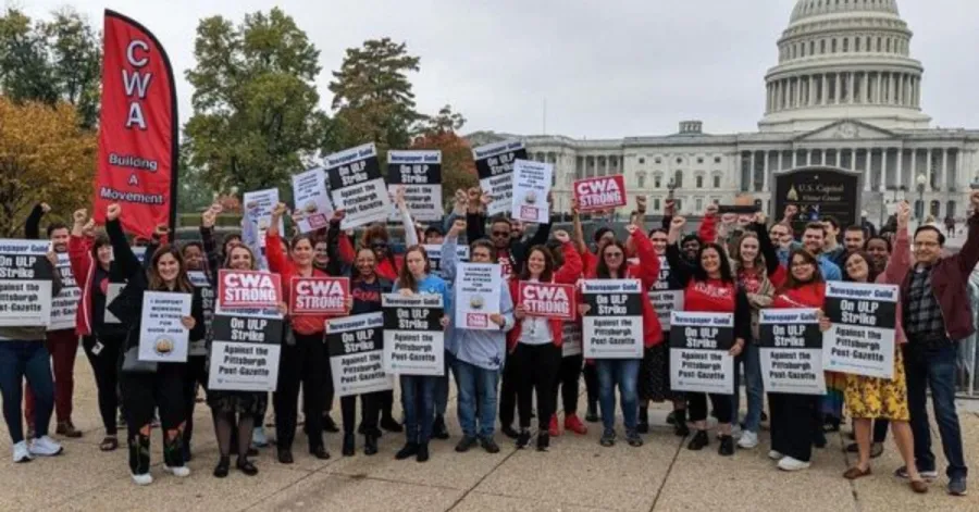 Members of CWA Locals 14842 and 14827, the Pittsburgh NewsGuild (TNG-CWA Local 38061), Teamsters Local 205/211, and Pressmen’s Union GCC/IBT Local 24M/9N are striking in response to unfair labor practices by management, including unilateral changes to their health care plan.