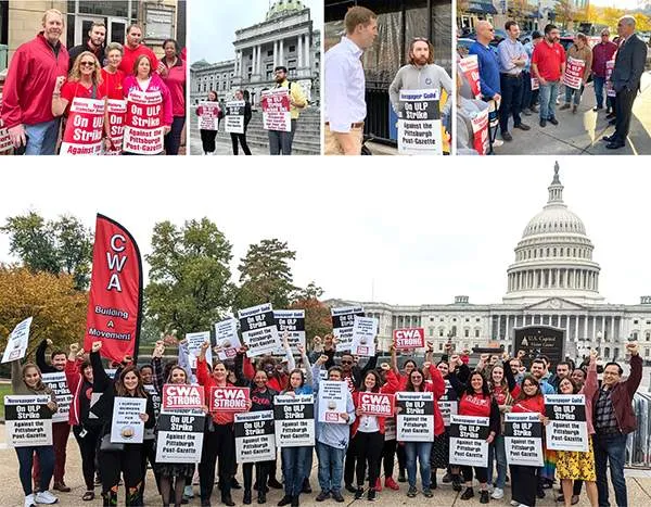 Workers continued to build support for their strike against the Pittsburgh Post-Gazette this week, rallying in Pittsburgh, Harrisburg, and Washington, D.C. They were joined by elected officials and CWA leaders and members from across the country.