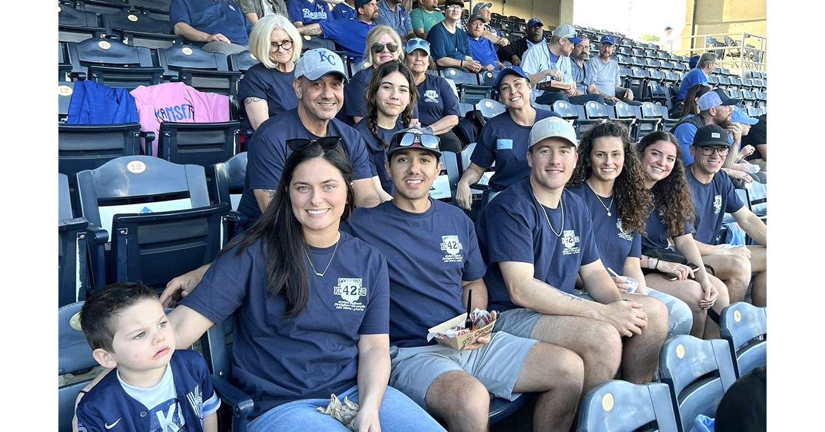 e2 Embroidery and Screen Printing owners, staff, and family sported their memorial t-shirts at a Kansas City Royals game. Joe Eddings and his wife Dawn (pictured middle row, separated by one of their three daughters) sold the shirts as a fundraiser for the family of slain Kansas City Fire Department paramedic Graham Hoffman. Workers at the print shop are represented by CWA Local 6360.