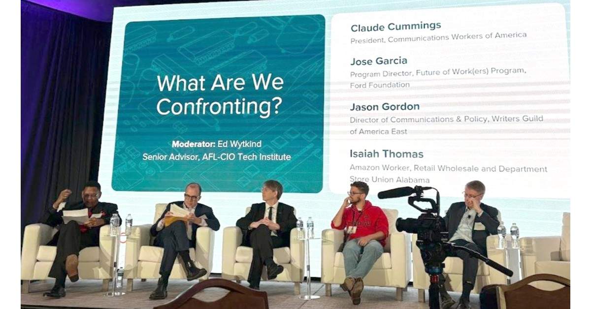 CWA President Claude Cummings Jr. (pictured above, at left) joined a panel last week to discuss the implications of burgeoning artificial intelligence and its threats to workers. The AFL-CIO Tech Institute held the Workers First AI Summit, focused on the impacts of AI on workers. CWA is leading the labor movement with groundbreaking contract protections against abuses of artificial intelligence used for surveillance, discipline, and content generation.