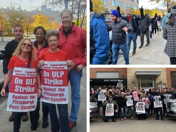 CWA Local 14842 and 14827, Teamsters Local 205/211, Pressmen’s Union GCC/IBT Local 24M/9N, and Pittsburgh NewsGuild (TNG-CWA Local 38061) on the picket line during the Pittsburgh Post-Gazette strike.