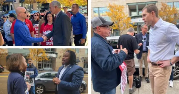 (Clockwise from top left) U.S. Senator Bob Casey, U.S. Representative Conor Lamb, and Pennsylvania State Representative Malcolm Kenyatta visiting the Post-Gazette picket line to lend support.